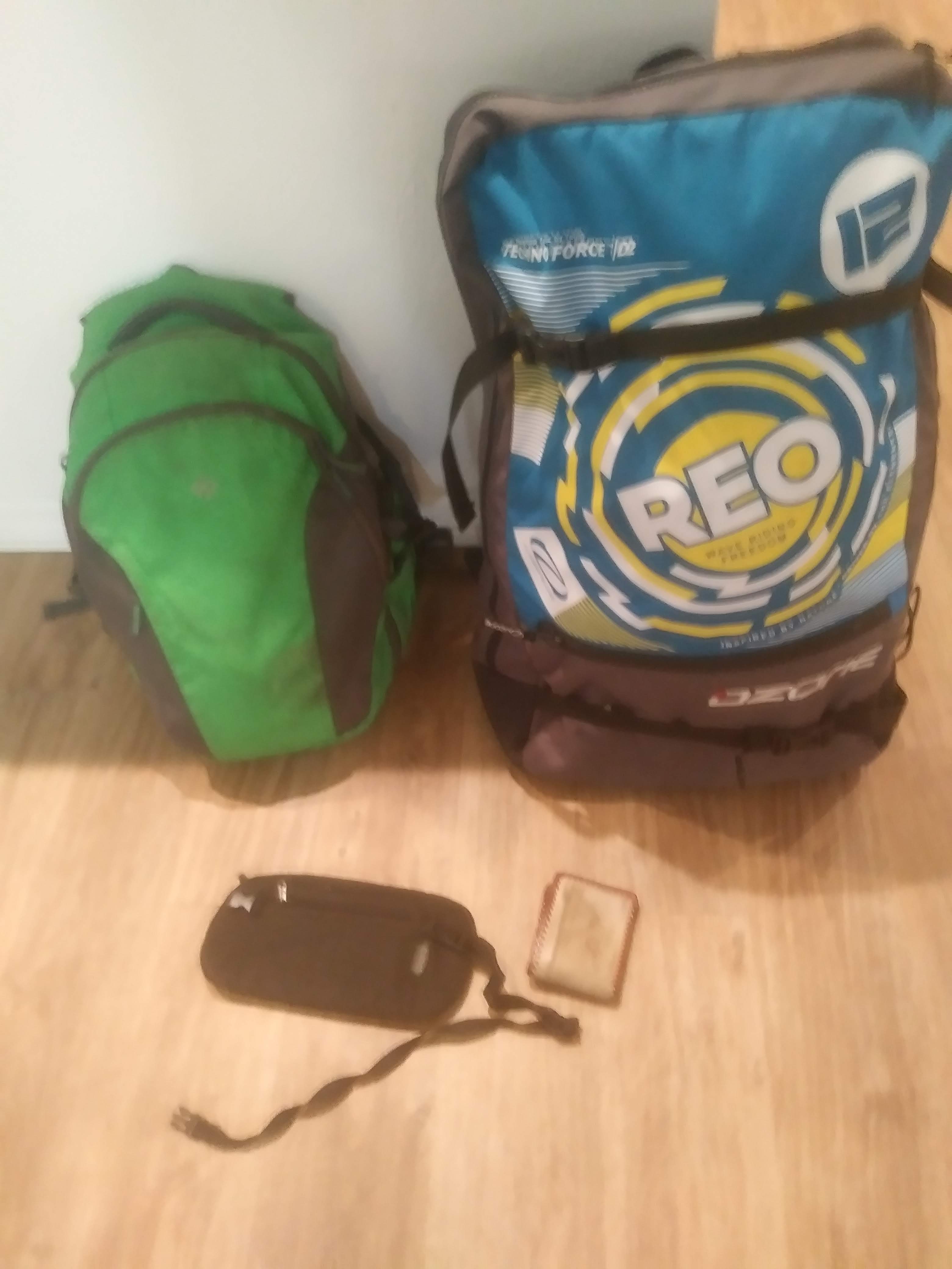 I have my carry on for the flight that will fit into my main bag when I arrive. I use a kitesurfing kite bag when I travel. I just like the way that it zips from the top and all the way down both sides. Easy to get stuff in and out of. I hope this has been of some use to you as you consider how to travel adventurously frugal!
