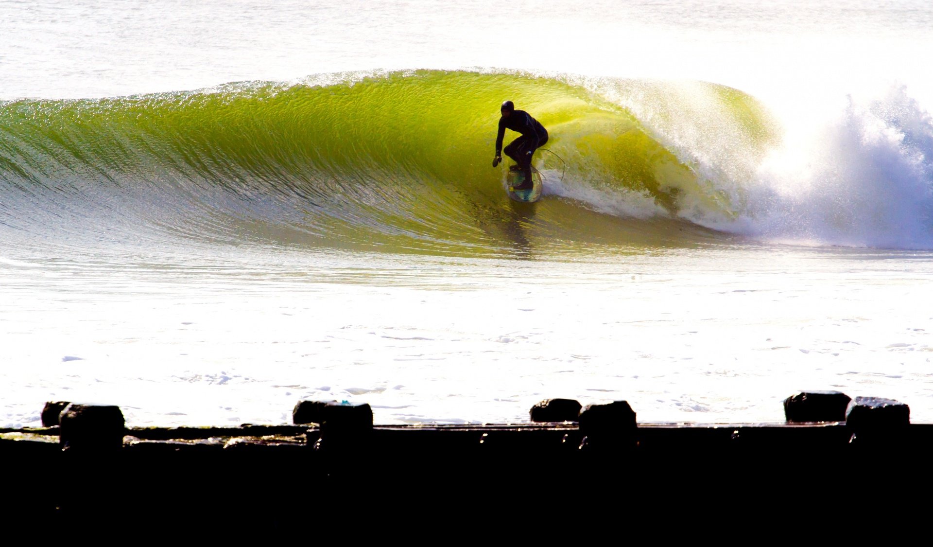 The Jersey Shore is known on the East Coast as a magnet for surf and it seems to go off during the coldest months as regular posts are seen in surfing magazines of the hardcore checking surf in total neoprene, standing on snow as the ice along the shore gives way to crystal lips peeling offshore. Manasquan Inlet has deep water offshore leading to it, while the jetty and sandbars line up long barreling rights. This is one of the few places on the east coast known to handle massive hurricane swells and still have shape. The inlet allows for challengers to paddle out in the biggest of sets and blocks the surf from southern winds. Deep water leading to the inlet, a beefy jetty and good sandbars conspire to provide long barreling righthanders. Sand stopping jetties up and down the coast provide plenty of places for surf, but this coast is crowded. At least until the big stuff hits and filters out those with smaller testicles.